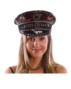 Diese glitzernde Militär Festival Schirmmütze in Bordeaux ist ein festliches Kostümzubehör für Damen. Die hochwertig verarbeitete Kopfbedeckung präsentiert sich mit Pailletten, Dekosteinen und einer eindrucksvollen Kette. So bist du für jede Straßenparade bestens gekleidet! Das Kostümzubehör im Marching Band Look passt zu venezianischen Fracks ebenso gut wie zu einem sexy Minikleid. Beides findest du in unserem gut sortierten Onlineshop!