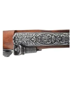 Die Steinschloss der Perkussionspistole ist in braunem Rosenholz gehalten. Das Steinschloss ist aus Metall gefertigt und mit Verzierungen aus der Zeit des 19. Jahrhunderts versehen, das die Piraten Pistole Echtholz zu einer realistisch wirkenden Steinschloss Pistole macht. Weitere Waffen Replika sind die Piraten Steinschloßpistole Echtholz und Magnum Revolver